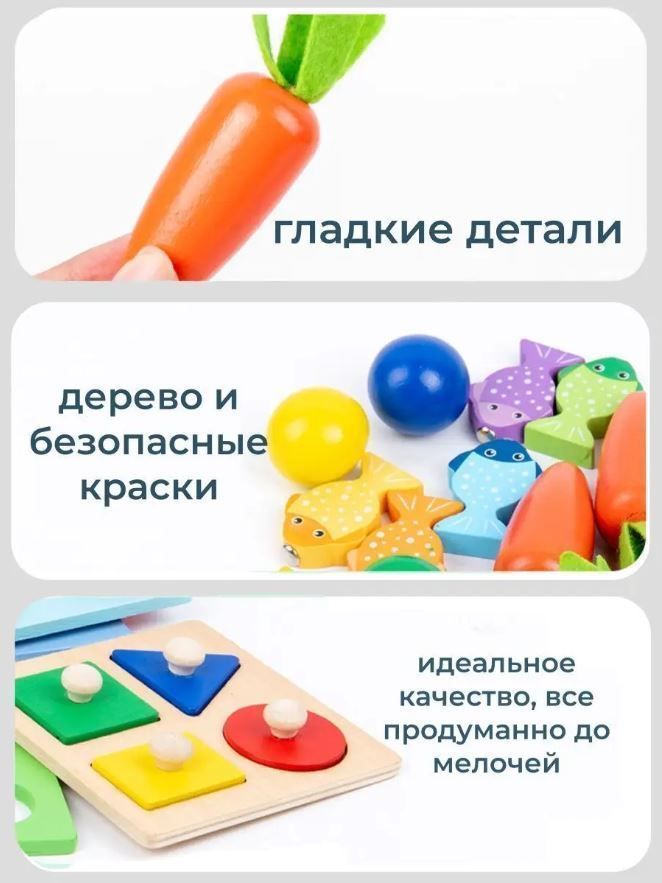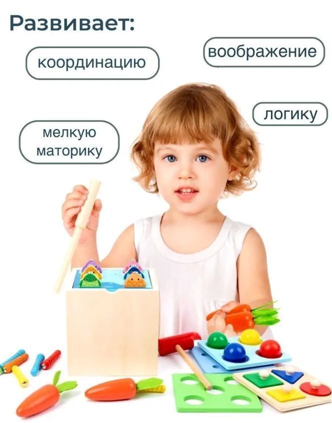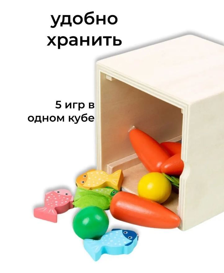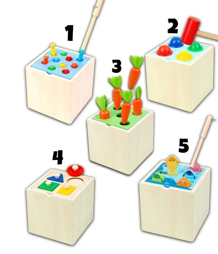 Игровой набор - пособие монтессори куб 5 в 1 - включает в себя 5 самых популярных игрушек для развития малышей: магнитные червячки, магнитная рыбалка, сортер морковки, стучалка с молотком по шарикам и пазл геометрик с удобными ручками. Игрушка выполнены из качественных и безопасных материалов и соответствуют стандартам качества, а сам деревянный куб сортер обеспечивает компактное хранение всех деталей. Он идеально подходит для подарка малышам от года до трех лет и старше, развивая их навыки и способности в соответствии с методикой раннего развития Монтессори, а так же для родителей, которые хотят развивать своих малышей играя вместе с ними. Играя в сортеры, пазл фигуры, малыши развивают геометрическое мышление и способствуют развитию цветового восприятия. Также в бизикубике есть развивающие умные игры для детей "вытяни морковку" удочка с рыбками, в том числе игра "рыбалка" с магнитными рыбками и червячками - игра "поймай червячка" , а так же игрушка сортер стучалка с молотком для малышей с шариками