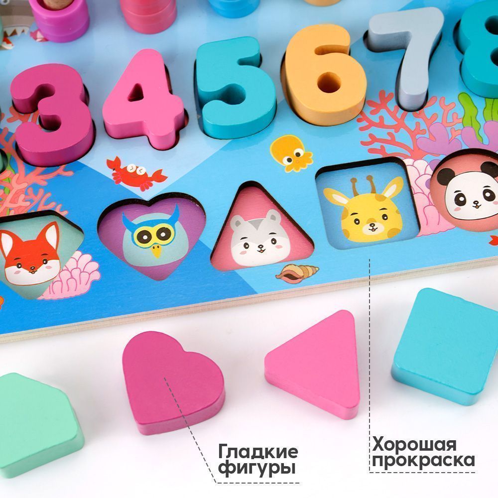 В этой игрушке есть цифры, разноцветные круги, буквы и животные, которые ваш ребенок может сортировать, расставлять или использовать в качестве счетов. Кроме того, у этого есть очень милая рыбацкая игрушка с деревянной рыбкой и удочкой, с которой малыши могут играть, когда им скучно. Крупные детали.