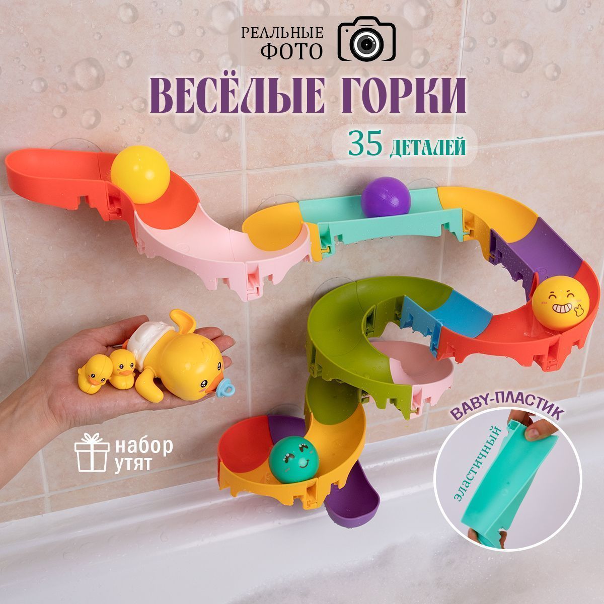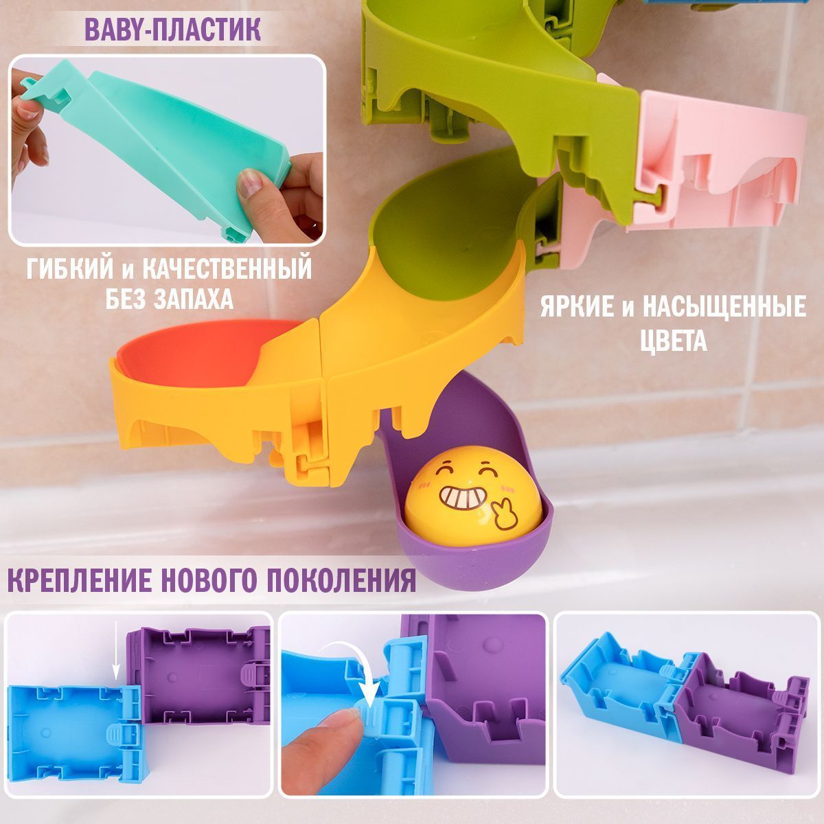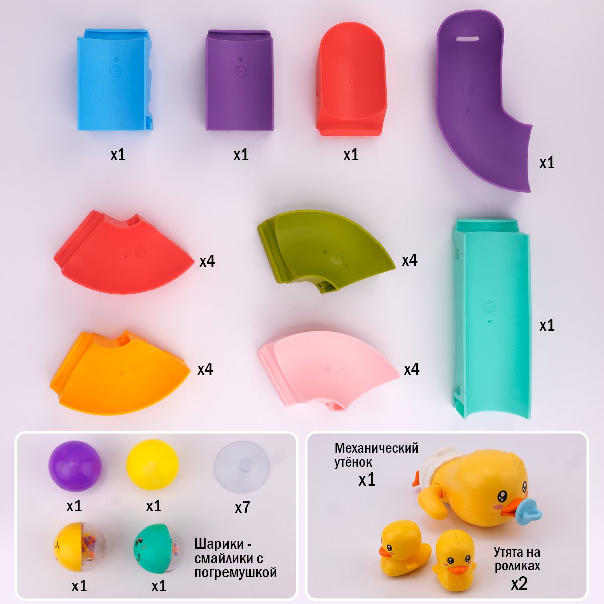 Комплектация: сетка для игрушек 1 шт; заводная уточка 1 шт; крючки 2 шт; ковш 1 шт; мельница 1 шт; елки 2 шт; дом 1 шт; колесо 1 шт; уточки 4 шт; уточки-капсулы 2 шт; уточки-шарики 2 шт; присоски 16 шт; крепления для колеса 1 шт; прямой элемент горки 4 шт; поворотный элемент горки 13 шт; начало горки 1 шт; круглый конец горки 1 шт; соединяющие элементы горки 13 шт; разветвляющий элемент горки 1 шт