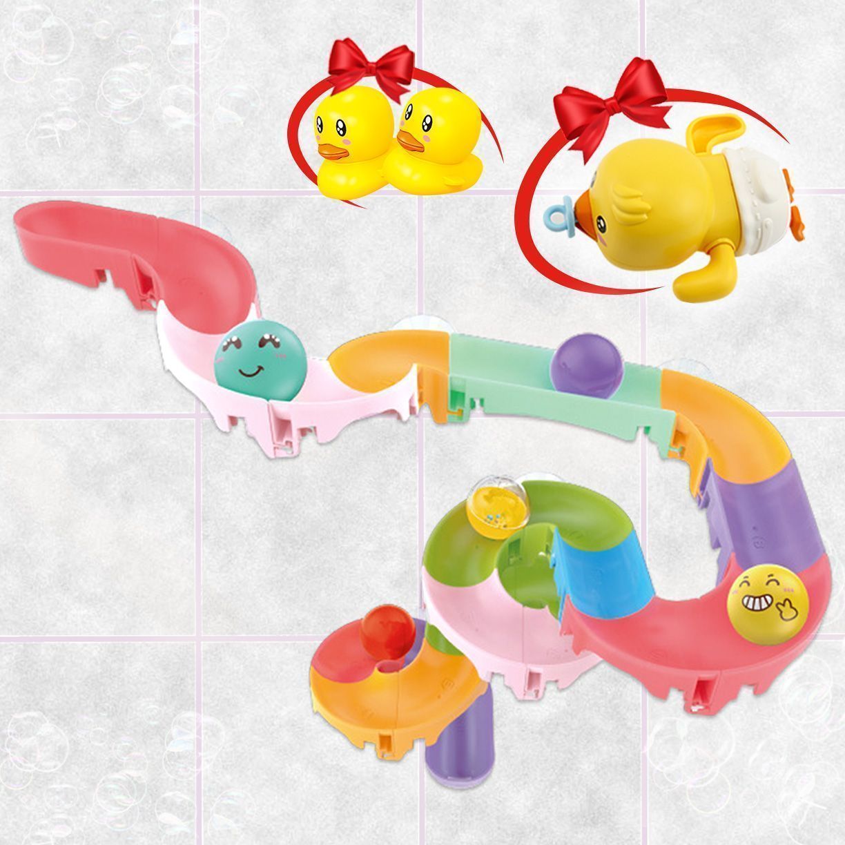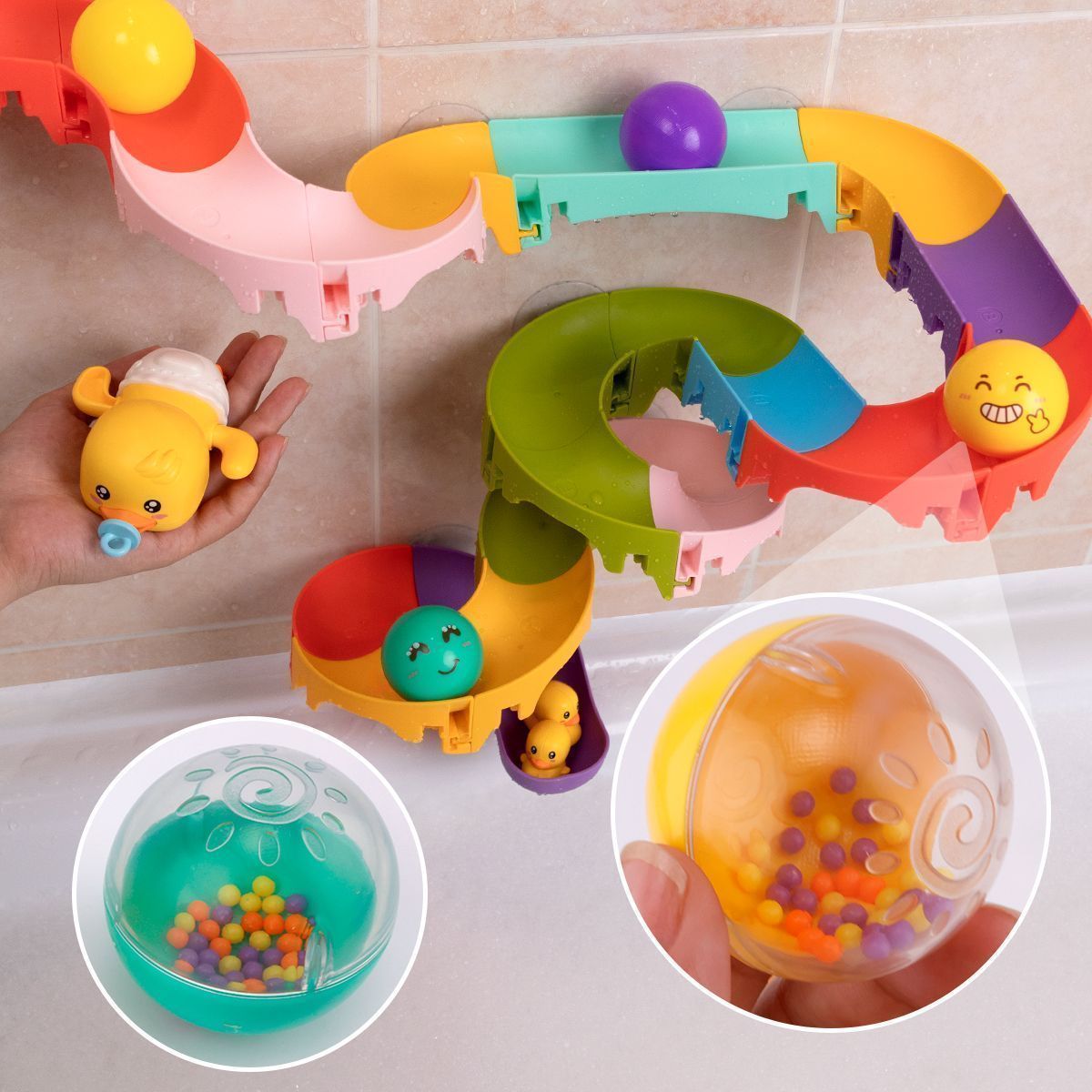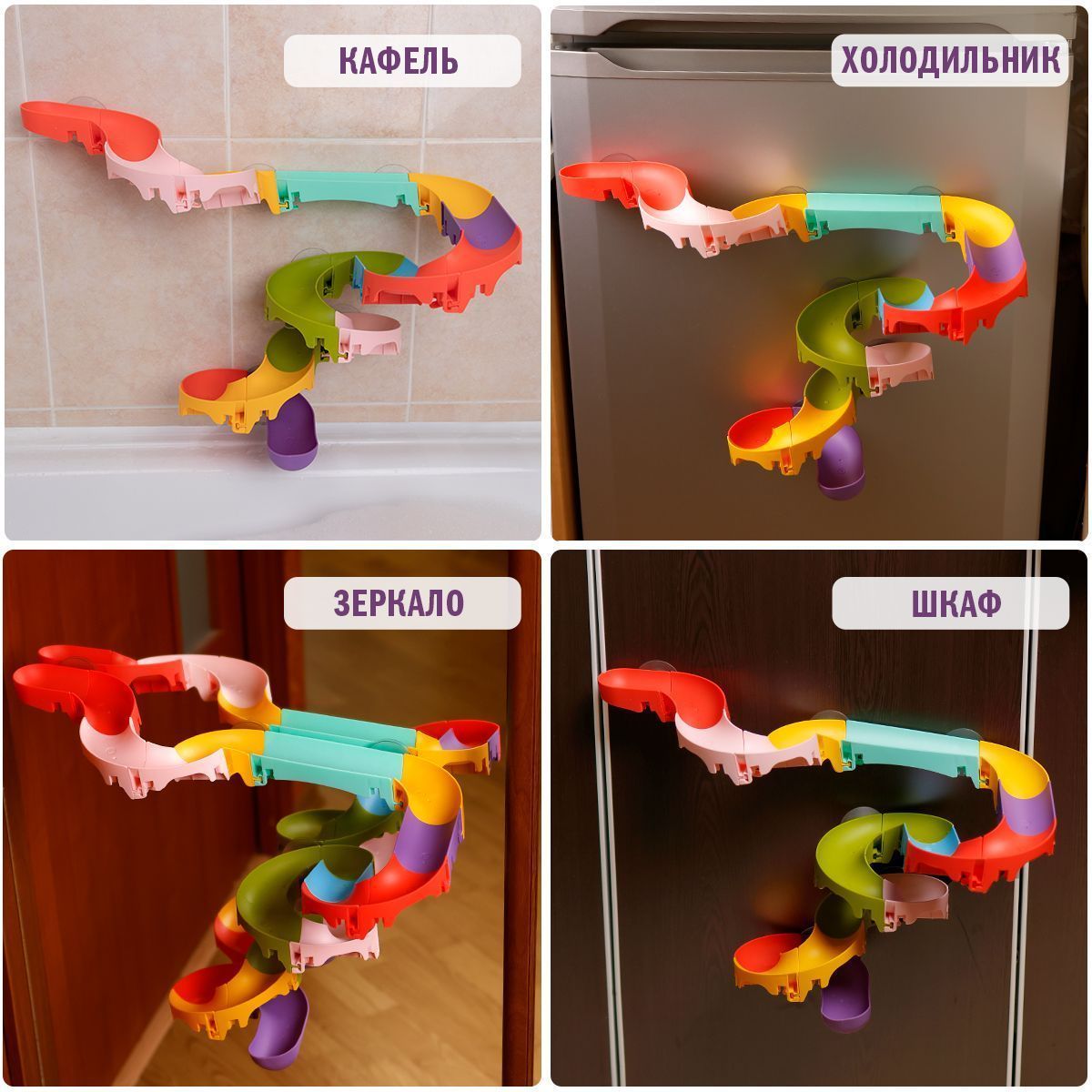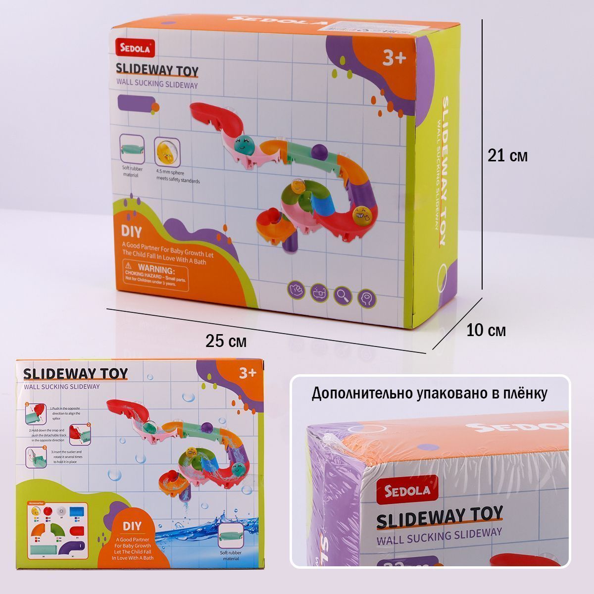 Комплектация: сетка для игрушек 1 шт; заводная уточка 1 шт; крючки 2 шт; ковш 1 шт; мельница 1 шт; елки 2 шт; дом 1 шт; колесо 1 шт; уточки 4 шт; уточки-капсулы 2 шт; уточки-шарики 2 шт; присоски 16 шт; крепления для колеса 1 шт; прямой элемент горки 4 шт; поворотный элемент горки 13 шт; начало горки 1 шт; круглый конец горки 1 шт; соединяющие элементы горки 13 шт; разветвляющий элемент горки 1 шт