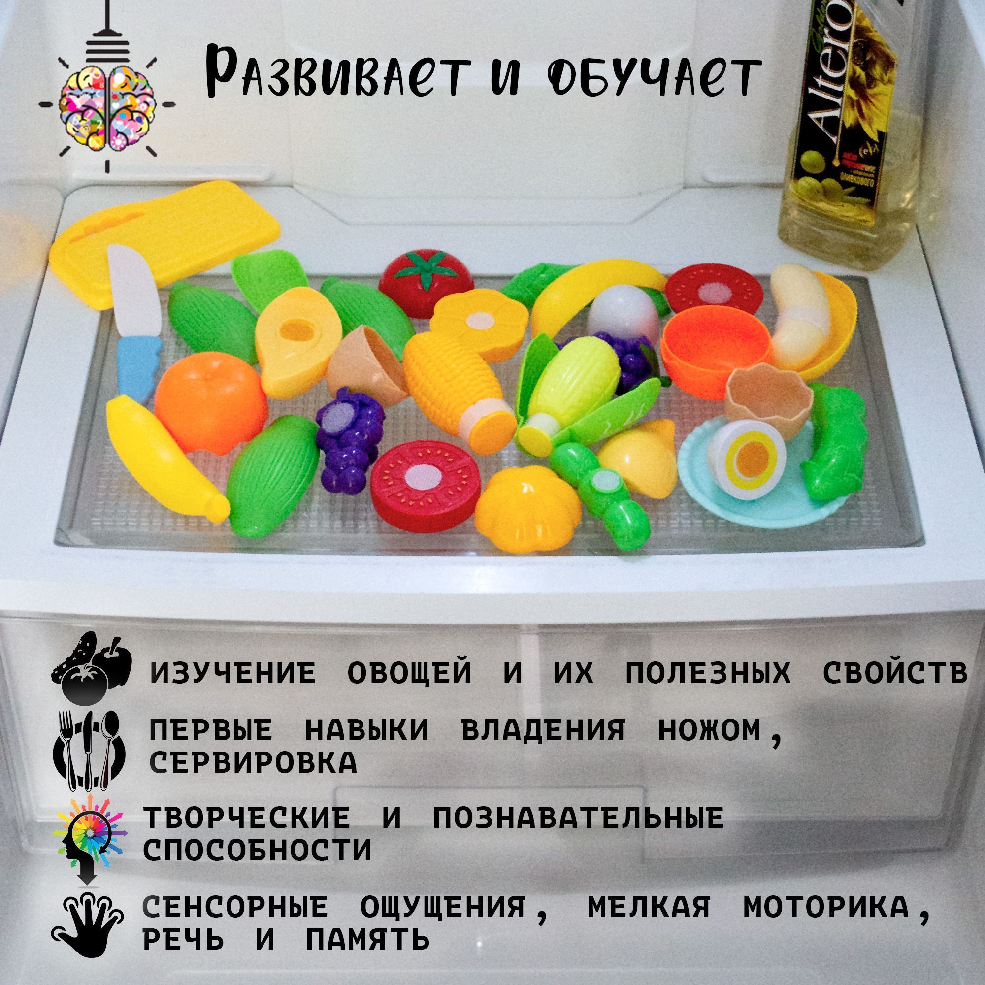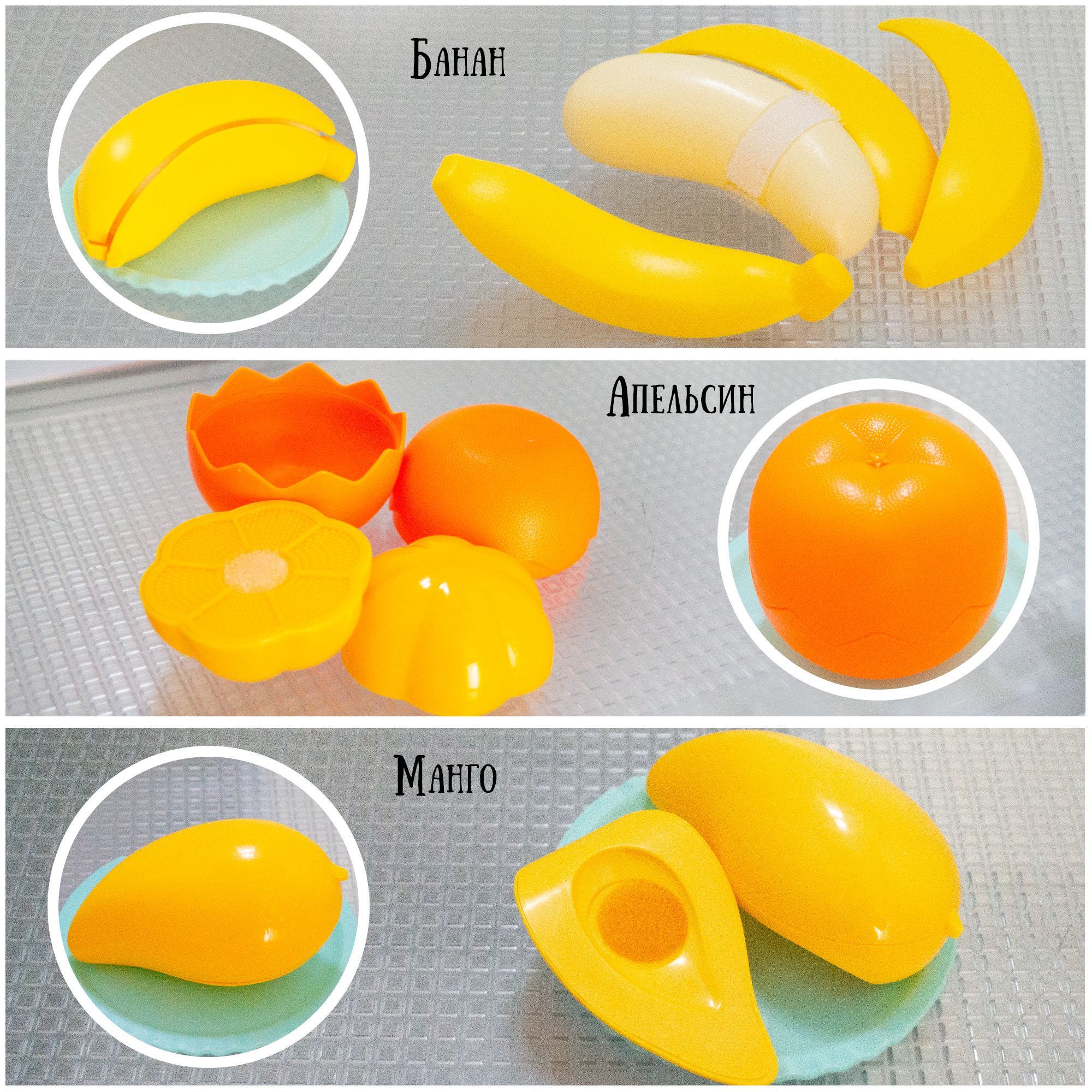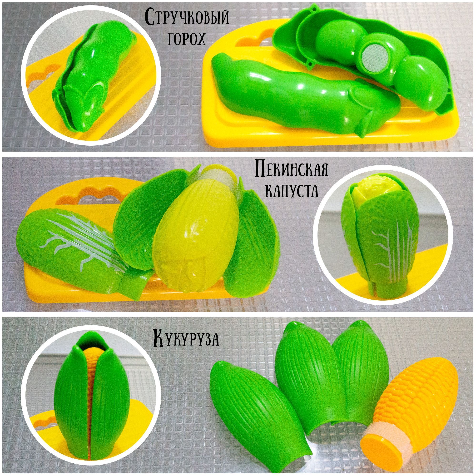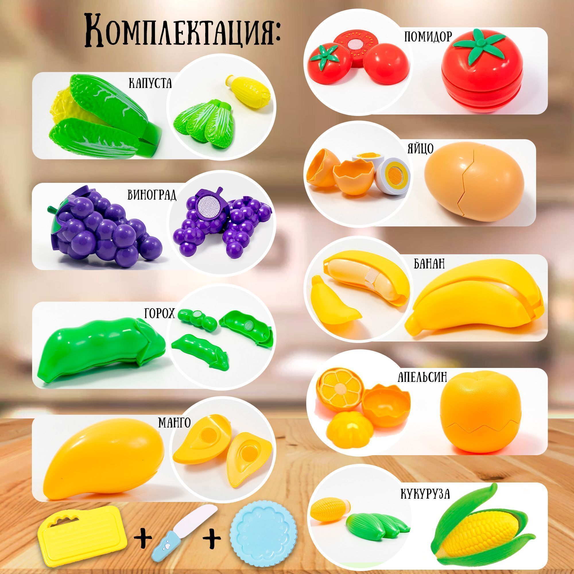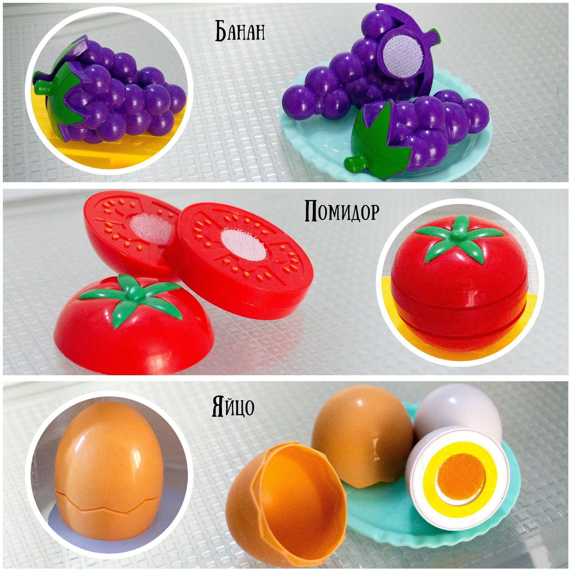 Овощи на липучках помогут во время игры сформировать представления о их полезных свойствах для человека, закрепить знания о характерных признаках: цвет, форма, вкус, сформирует количественные представления (один-много) у самых маленьких, а детей постарше можно обучать счёту. Фантазируйте вместе с ребёнком во время игры, придумывайте новые задания и сюжеты. Для детей от года игра станет хорошим тренажёром мелкой моторики и логики. Разобрав овощи на части, можно попросить ребёнка найти подходящую половинку. Игры на липучках всегда можно взять с собой на прогулку, в гости, в путешествие. Все составляющие набора выполнены из пластика, поэтому их легко мыть и обрабатывать. Игрушечные продукты станут хорошим подарком в группу детского сада. Комплектация: Яйцо 1шт. Апельсин 1шт. Помидор 1шт. Горох 1шт. Кукуруза 1шт. Виноград 1шт. Банан 1шт. Манго 1шт. Пекинская капуста 1шт. Разделочная доска 1шт. Ножичек 1шт. Тарелочка 1шт.