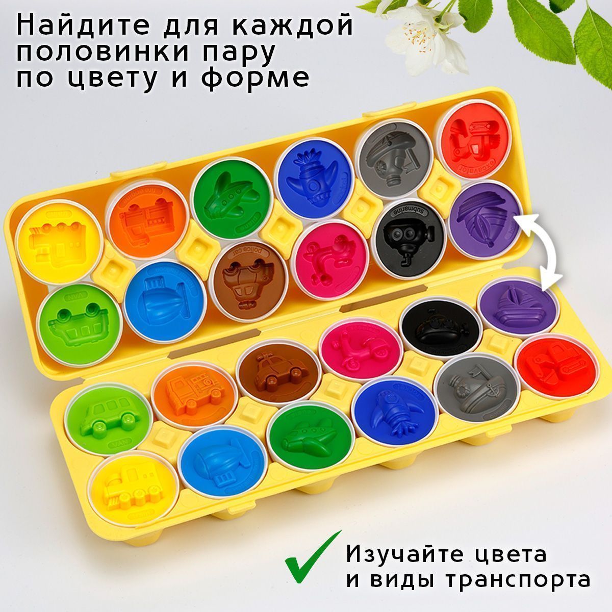 Сортер яйца транспорт 12шт. в контейнере. Увлекательная игра сортер относится к классическим развивающим игрушкам Монтессори. Каждое яйцо-пазл раскладывается на две части. Внутри яйцо имеет свою форму машинки и цвет. Игровой набор сделан из безопасного ABS пластика и не имеет острых углов, поэтому ребёнок не поранится в процессе игры. Идеальный размер для маленьких детских ручек позволяет малышу ловко захватывать и удерживать яйцо. Легко мыть и обработать, подойдёт для детского сада, можно использовать в ванной для игр во время купания. Игровое пособие развивает мелкую моторику и координацию движений, логику, память. Познакомит с различными цветами и формами, научит считать. Используйте для игры сразу все яйца или только их часть, постепенно добавляя остальные и усложняя игру. Фантазируйте вместе с малышом, придумывайте новые загадки и головоломки. Полезную игрушку можно использовать как штампик при игре с пластилином и кинетическим песком или для игры в мемо, изучая водный, наземный и воздушный транспорт.
